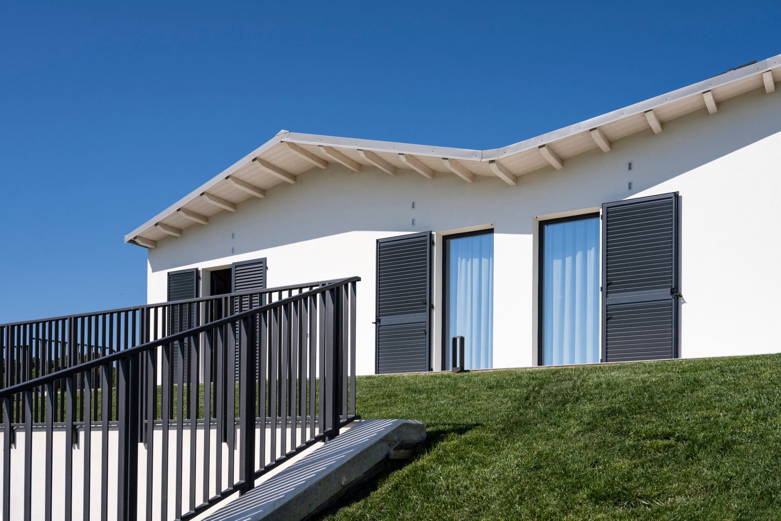 La casa si presenta come un volume allungato ed essenziale, inserito con misura nel profilo della collina. La copertura dinamica scandisce le facciate con cambi di quota e sporti, disegnando un profilo riconoscibile.